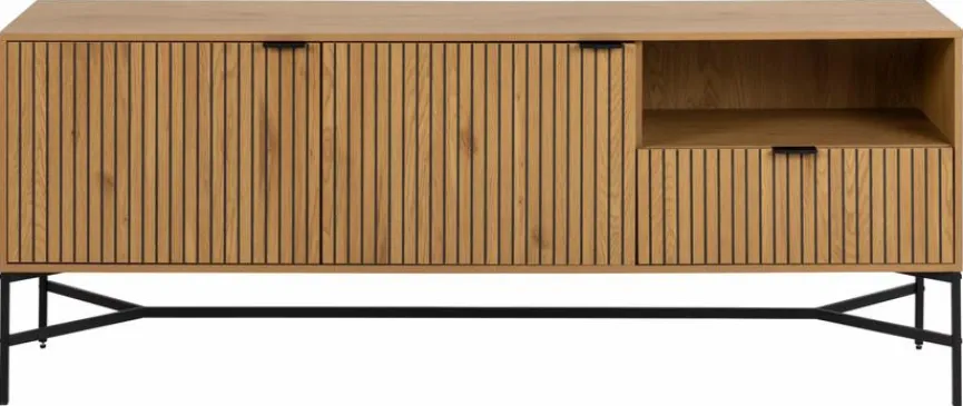 Zum zeitgemäßen Einrichtungsstil in naturnaher Optik passt das Sideboard Jaipur von Actona. Mit einer dekorativen Front aus Lamellen fügt sich die zeitlos schöne Kommode in Holzoptik harmonisch in das Wohnzimmer ein. Hinter zwei Türen, einer Schublade und in einem offenen Fach ist im Sideboard Jaipur reichlich Platz zur Aufbewahrung von Alltagsgegenständen und Erinnerungsstücken vorhanden.