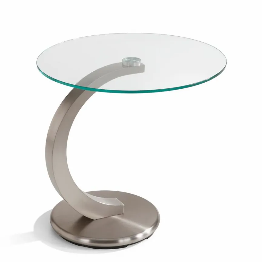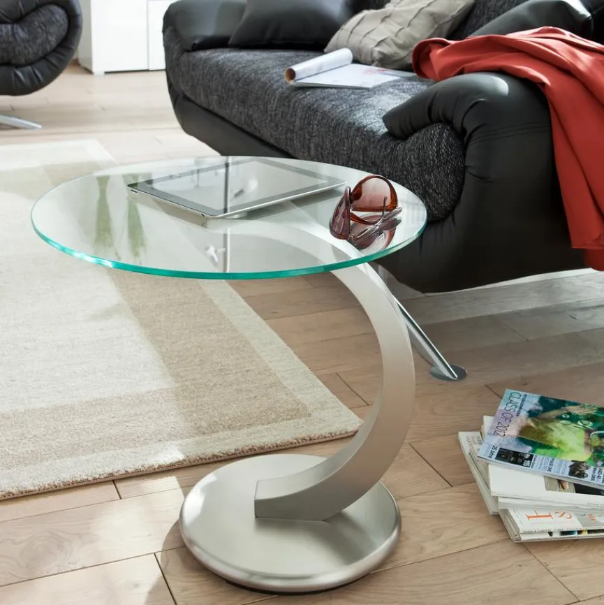 Der Beistelltisch Cosenza wirkt vor allem mit seinem geschwungenen Design. Die kreisrunde Tischplatte aus Glas wird von einem halbbogenförmigen Fuß aus Metall gehalten. Dieser kleine Tisch passt toll in ein modernes Wohnumfeld oder auch in repräsentative Geschäftsräume. .