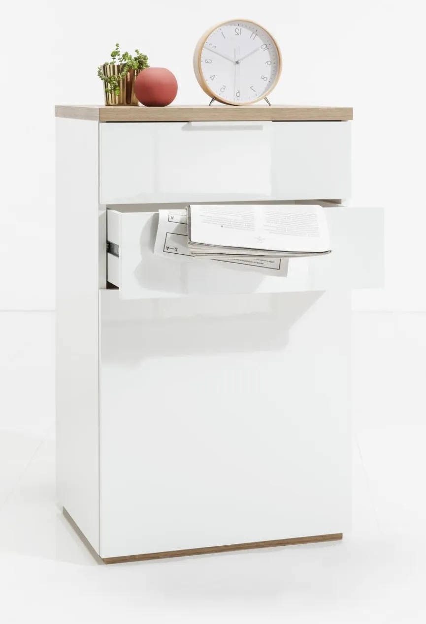 Die Kommode Mundi aus dem Hause Composad begeistert durch ein stylishes Äußeres, das sich perfekt in moderne Wohnumgebungen einfügt. Mit dem hochglanzlackierten Korpus und der farblich abgesetzten Topplatte avanciert das Möbel zu einem echten Designerstück. In mehreren Fächern bietet die Kommode Mundi von Composad viel praktischen Stauraum für kleinere Gegenstände.