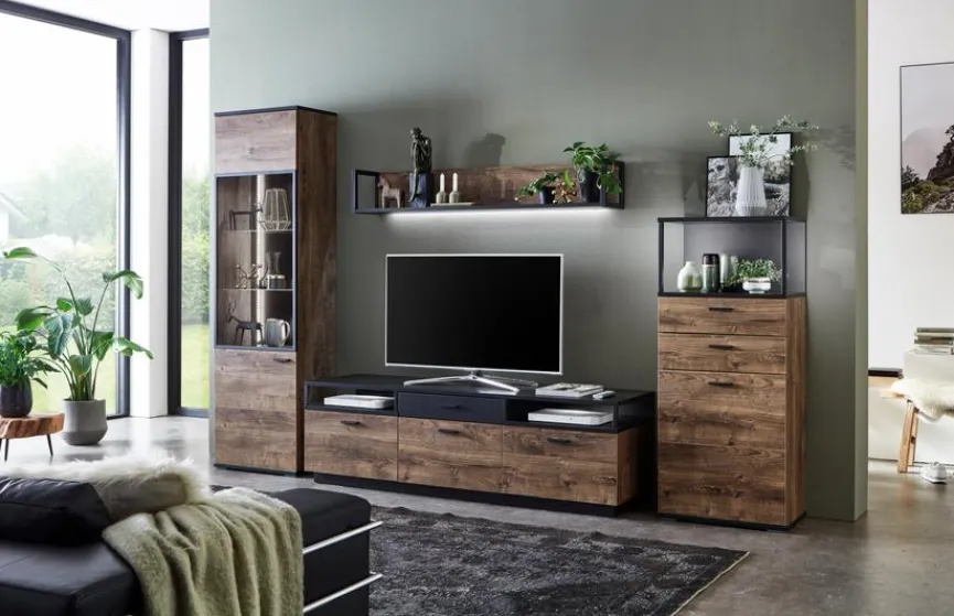 - Wohnwand aus Vitrine, Wandboard, TV-Lowboard und Vitrine