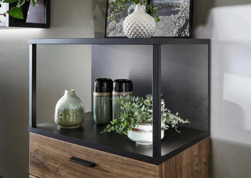 - Korpus aus Spanplatte mit Melaminharzfolie in Eiche Ribbeck Cognac und Absetzung in Cosmos Grey