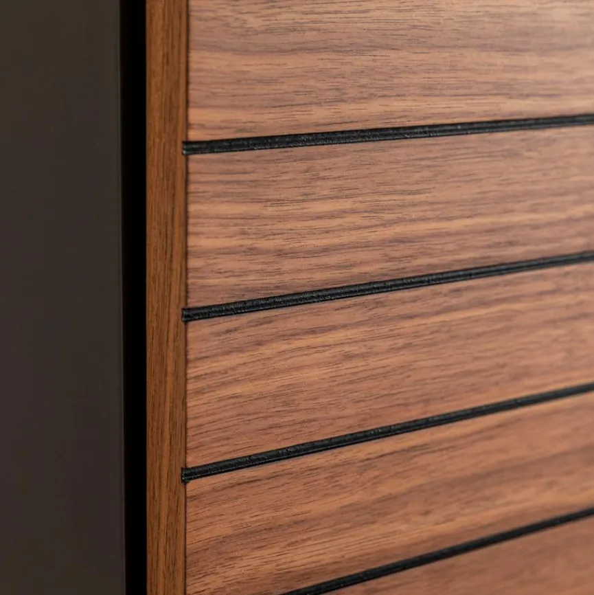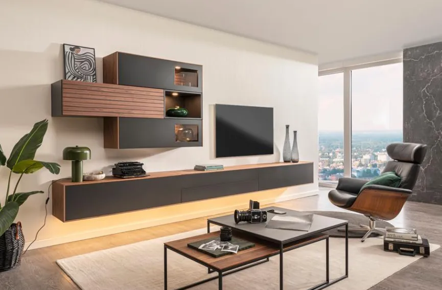 - Aus Holzwerkstoff mit Lack in anthrazit, Absetzungen aus Holzwerkstoff mit Echtholzfurnier in Nussbaum, untere Abdeckplatte des TV-Lowboards mit Echtholzfurnier in Nussbaum, Hängeelement mit Lamellenrückwand