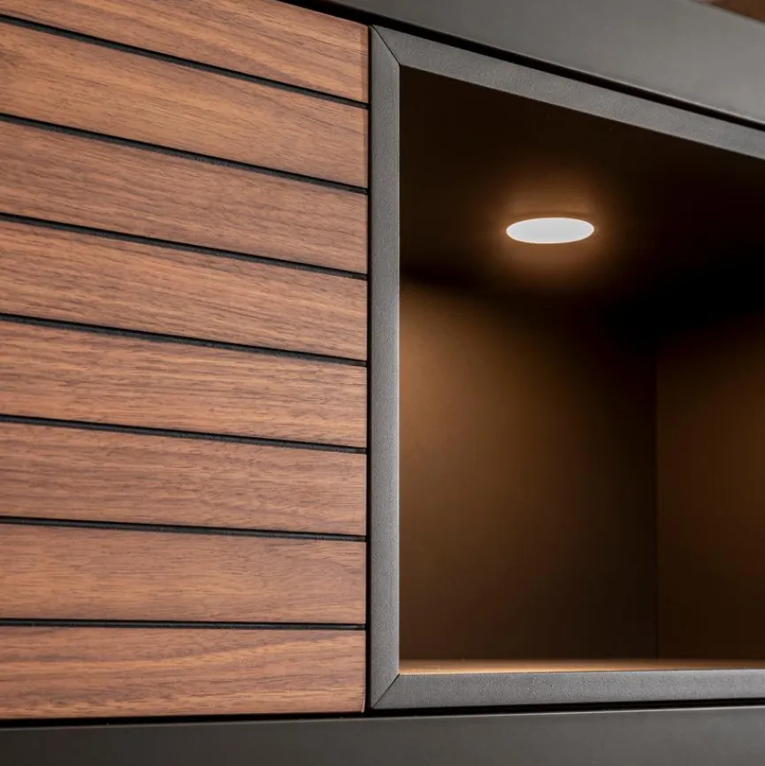 - Inkl. 1 LED-Streifen für TV-Lowboard und 3x LED-Spots für Vitrinenelement, mit Fernbedienung