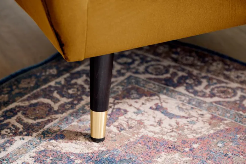- Bezug aus Stoff in mustard, Füße aus Holz mit goldfarbener Metallapplikation