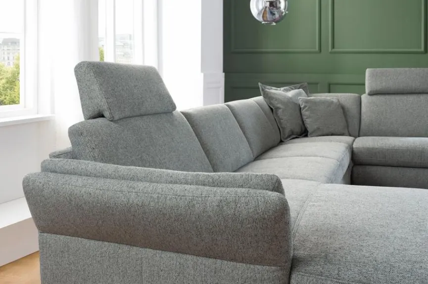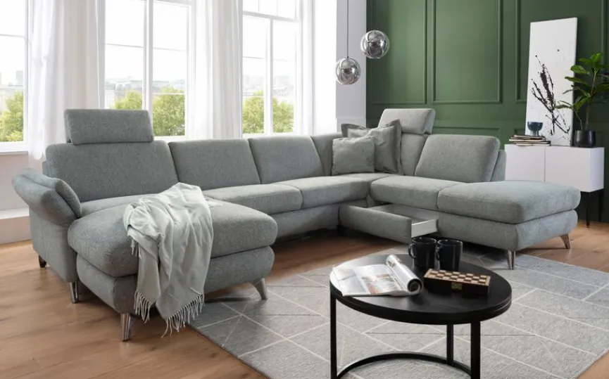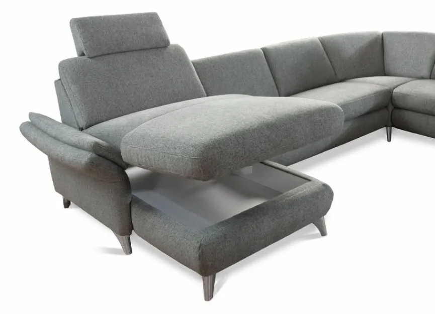 - inkl. Schubkasten in der Ottomane, Querschläfer echt bezogen im 2-Sitzer, Bettkasten im Longchair und Armteilverstellung beim Longchair