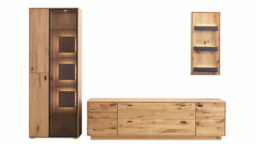 - Wohnwand aus Vitrine, TV-Lowboard und Hängeregal