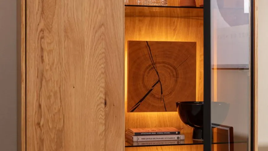 - Sichtbare Rückwände aus Ast/Balkeneiche furniert in Wildeiche geölt, Hirnholzblöcke aus Ast/Balkeneiche massiv in Wildeiche geölt