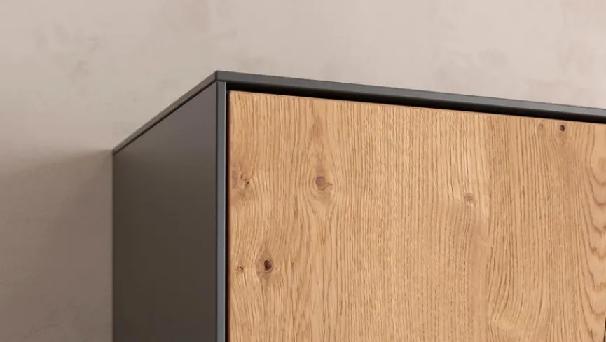 - Front der Hängeelemente aus Melaminharzfolie in Schiefergrau, Front des Standelements aus Echtholzfurnier in Riffeiche