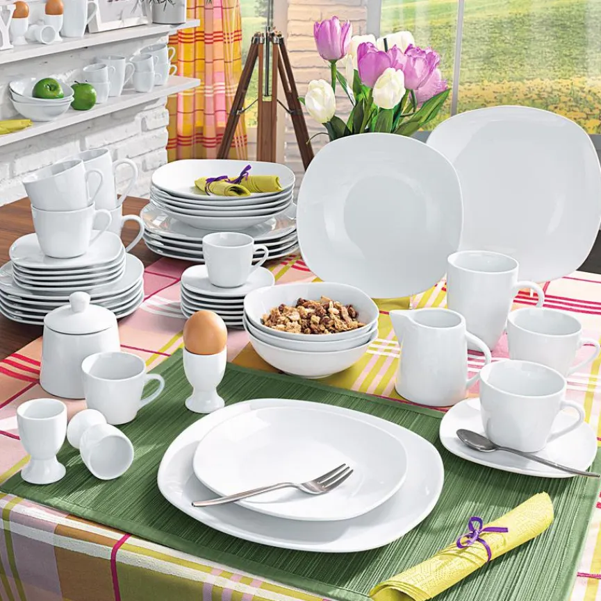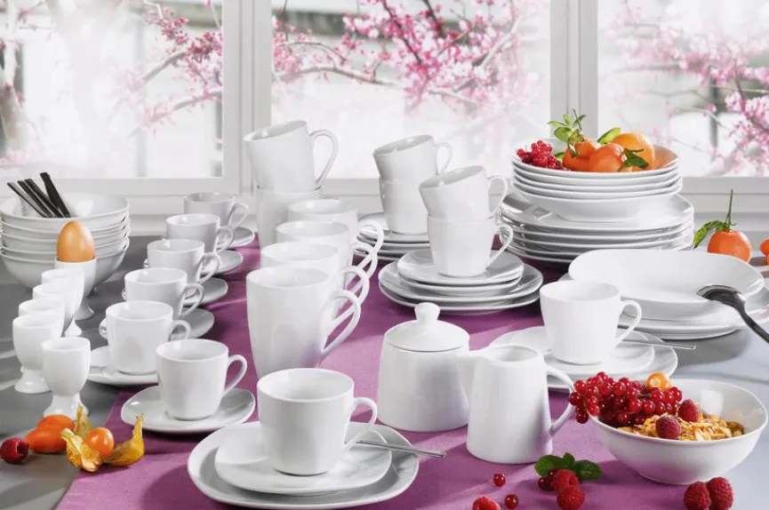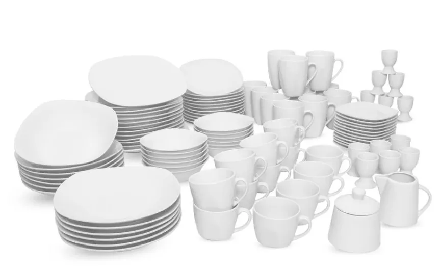 - Artikel beinhaltet je 12x Speiseteller Ø 26,6 cm, Suppenteller Ø 22,8 cm, Frühstücksteller Ø 20,3 cm, Kaffeetasse 220 ml, Kaffeuntere Ø 14,3 cm, Müslischale Ø 15 cm, Kaffeebecher 295 ml, Eierbecher