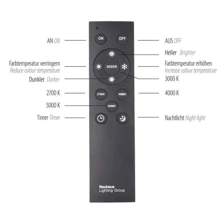 - Mit Fernbedienung zum Dimmen, Einstellen der Farbtemperatur ( 2200 – 5000 Kelvin)