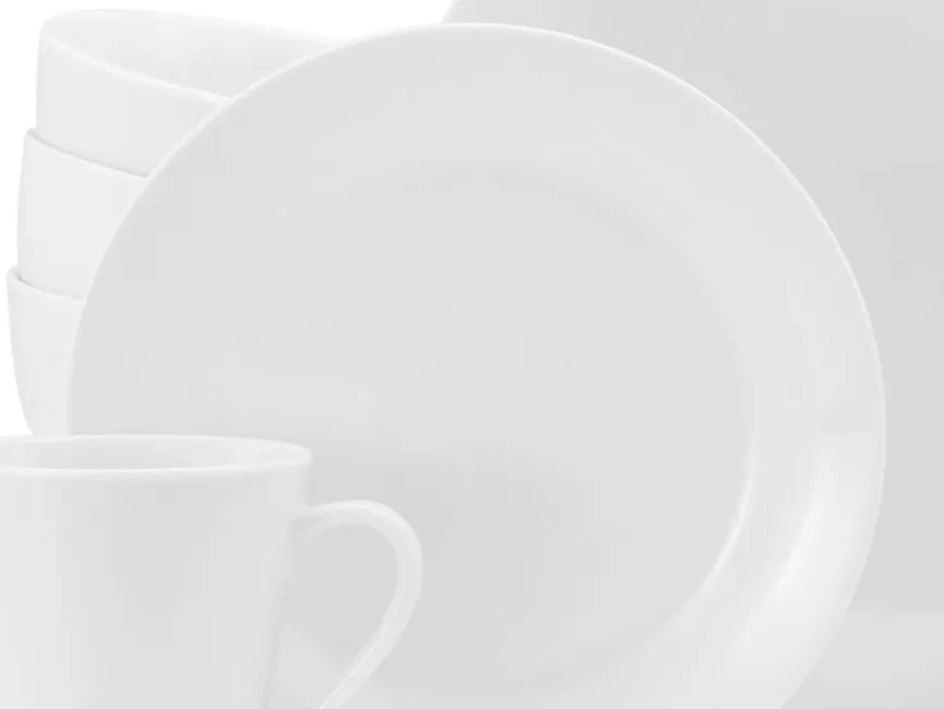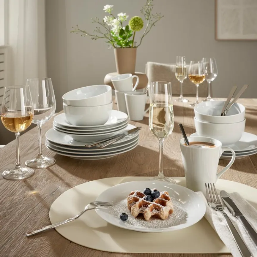 - Je 4 Speiseteller Ø 27 cm, Suppenteller Ø 22 cm, Frühstücksteller Ø 20,5 cm, Kaffeebecher 300 ml, Müslischalen Ø 14 cm