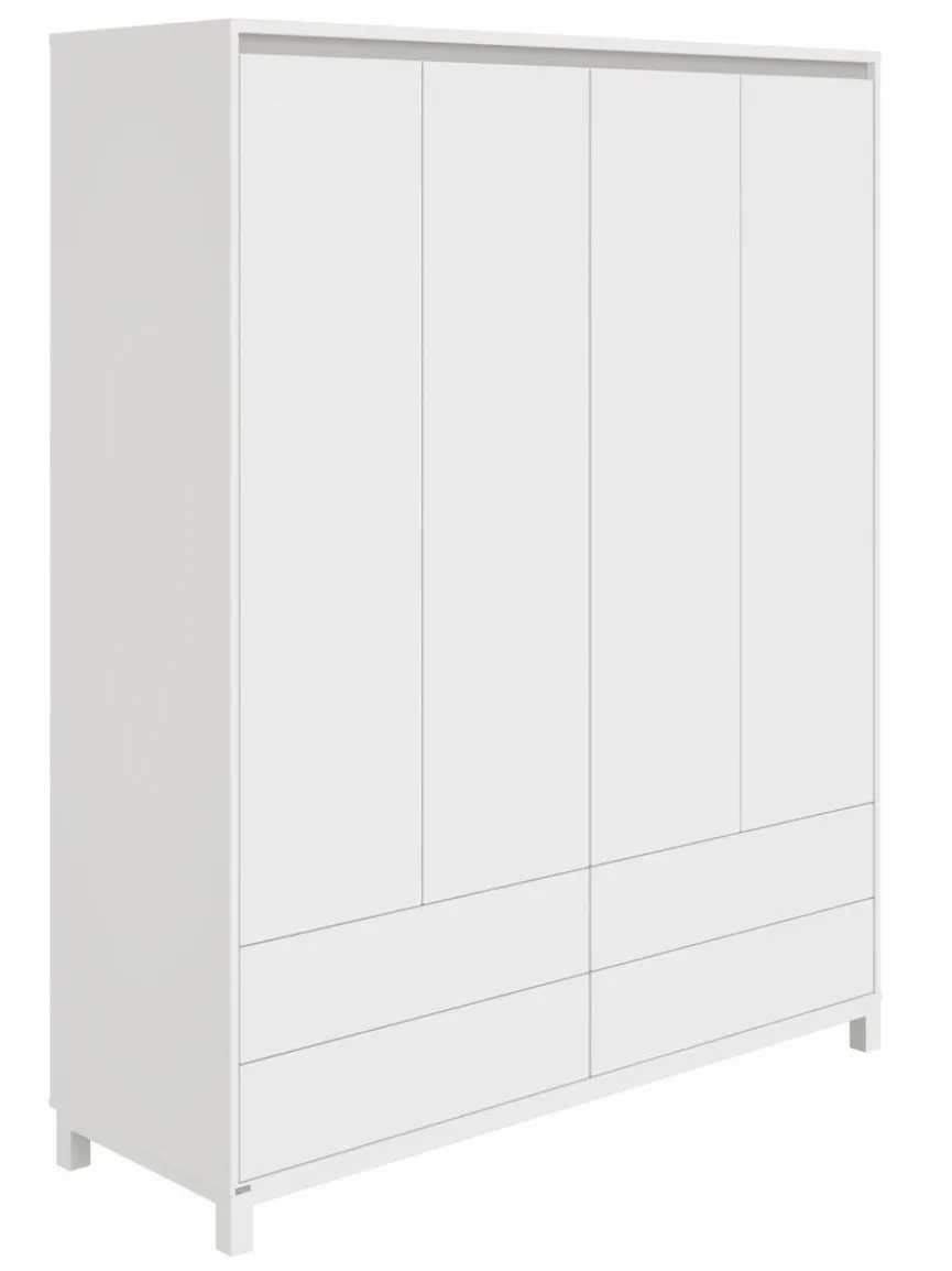 - Mit 4 Türen, 4 Schubkästen unten, 8 Einlegeböden und 2 Kleiderstangen