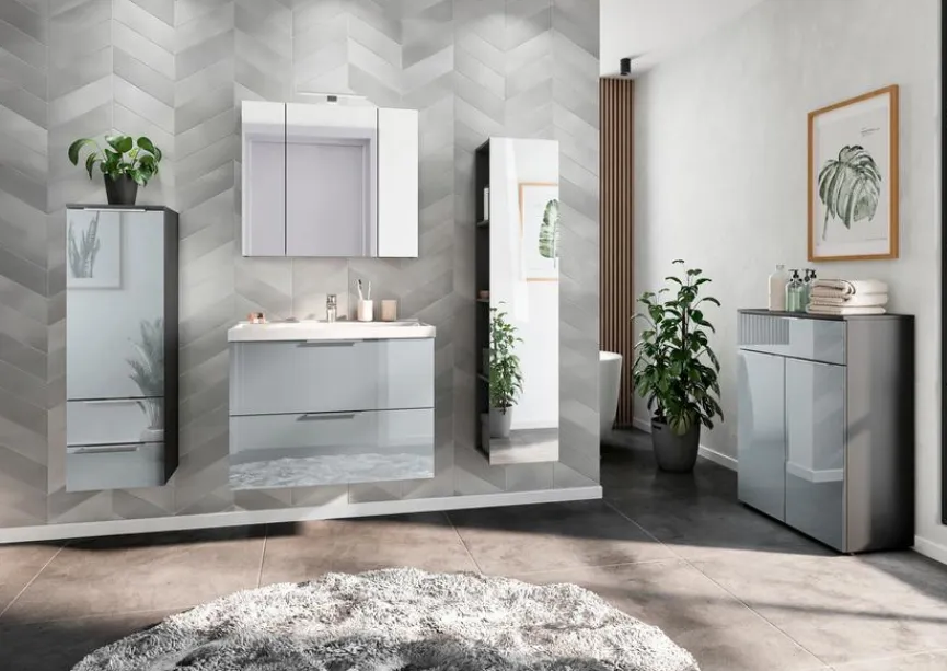 Frisches Design mit klarer Linienführung und ein edler Materialmix machen den Waschbeckenunterschrank Vasio von Germania unverwechselbar und verleihen ihm eine besondere Note. Stilprägend sind sein matter Korpus und zwei geräumige Schubladen mit spiegelnder Glasfront, in denen im Handumdrehen Handtücher und Badutensilien verschwinden. Der großzügig geschnittene Waschbeckenunterschrank Vasio beschert Ihnen Ordnung und Struktur und trägt zu einem edlen Look Ihres Badezimmers bei.