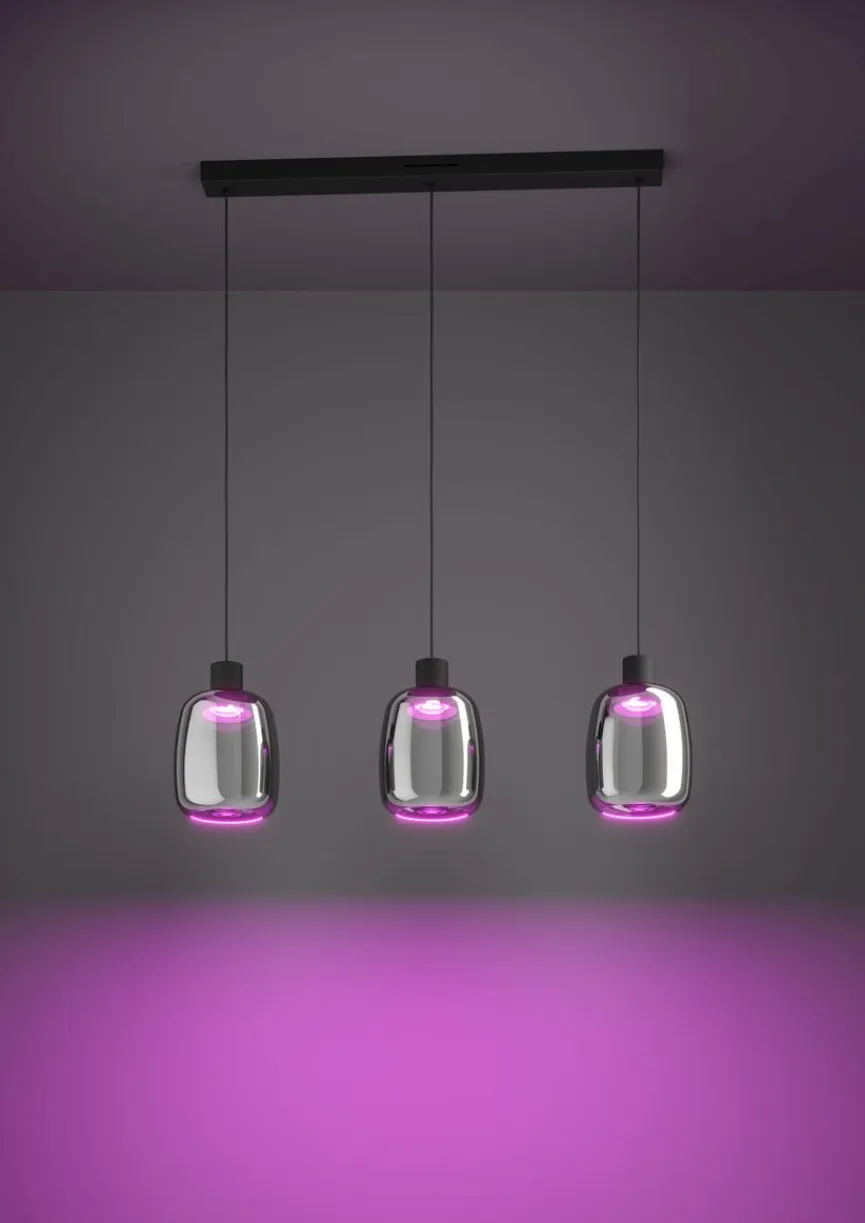 Die Pendelleuchte Molochio Z aus dem Hause EGLO bietet sowohl Chic und Extravaganz als auch moderne Technologien. Rundlich geformte, bedampfte Glasschirme machen den spannenden Look dieser bewusst reduziert gehaltenen Pendellampe aus. Zu den Features der komfortabel steuerbaren Pendelleuchte Molochio Z gehören eine Farbwechsel- sowie eine Dimmfunktion.