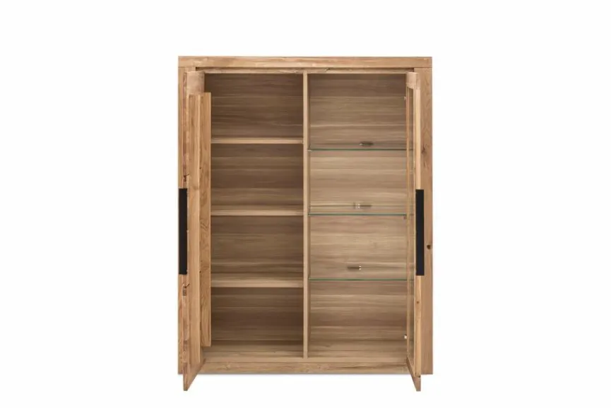 Die Vitrine Greta erfreut ihre Besitzer sowohl durch ihr edles Holzdekor als auch mit dem durch eine Glastür geschützten Bereich. In diesem Abteil der Glasvitrine können Sie auf verschiedenen Ebenen gezielt einige edle Schaustücke Ihrer Porzellansammlung oder andere Kostbarkeiten präsentieren. Auch mit dem Metallgriff zeigt die Vitrine Greta ein stilvoll designtes Element, das den positiven Eindruck abrundet.