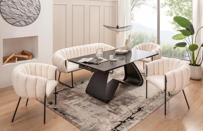 Mit seinem außergewöhnlich geformten Gestell und der Bubble-Optik auf der Platte stellt der Esstisch mit Auszug Sonora 180(280)x98 cm ein Design-Schmuckstück dar, das Luxus pur ausstrahlt. Kombiniert mit eleganten, bequemen Stühlen verwandelt dieser Esszimmertisch Ihren Speisesaal in ein modernes Nobelrestaurant. Kommen mehr Gäste, können Sie den Esstisch mit Auszug Sonora 180(280)x98 cm schnell vergrößern.