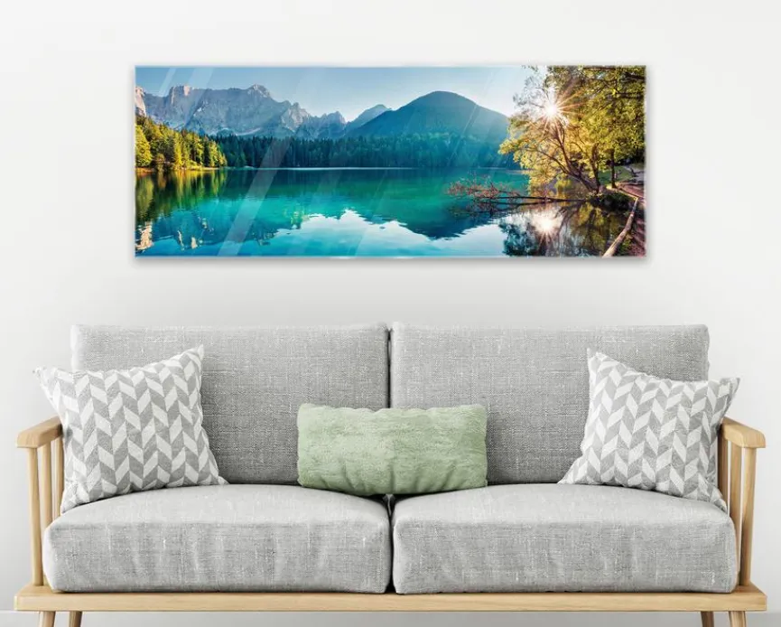 Das Glasbild 30×80 cm Fusine Lake von EUROART präsentiert eine wundervolle Szene am See, den Wald und die Spiegelungen im Sonnenschein in kräftigen Farben. Mit seiner fotorealistischen Darstellung fängt es die Schönheit der Natur ein. Die einfache und schnelle Anbringung sowie die glänzende Oberfläche machen das Glasbild 30×80 cm Fusine Lake zu einem echten Blickfang.