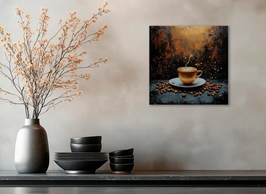 Das Wandbild 30×30 cm Golden Coffee von EUROART drückt für Liebhaber von frischem Bohnenkaffee, Cappuccino oder Latte Macchiato ein Lebensgefühl aus. Dieses Deko-Bild trägt zum Beispiel in der Küche, im Homeoffice oder im Wohnzimmer zu einer entspannten, gemütlichen Atmosphäre bei. Vor der wohlverdienten Pause kann allein schon ein Blick auf das Wandbild 30×30 cm Golden Coffee mental entschleunigen.