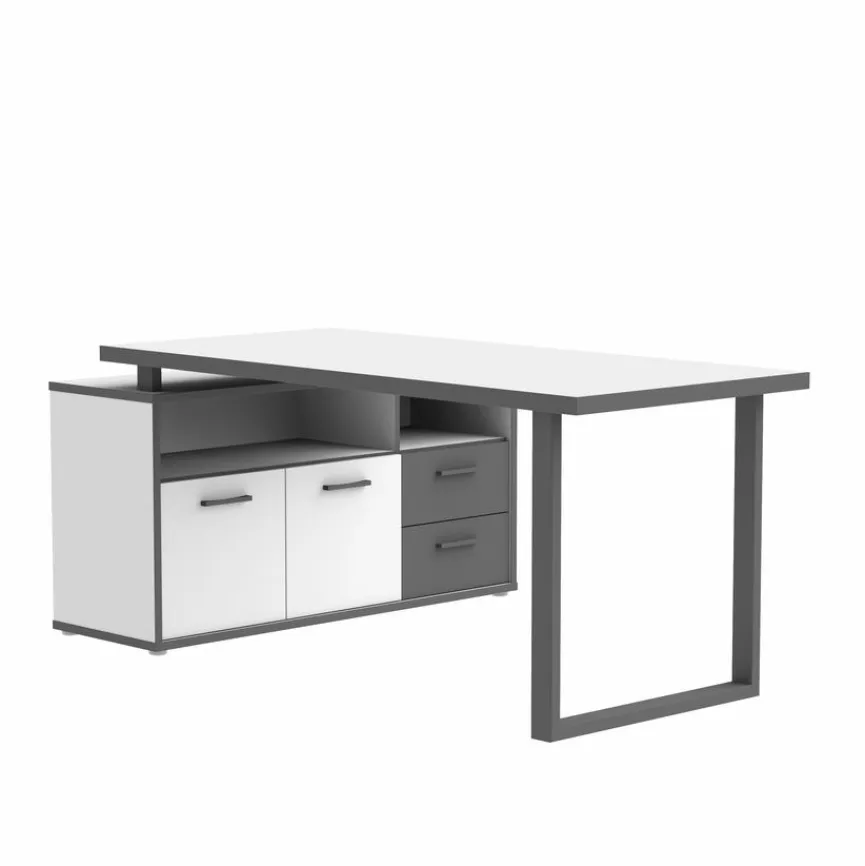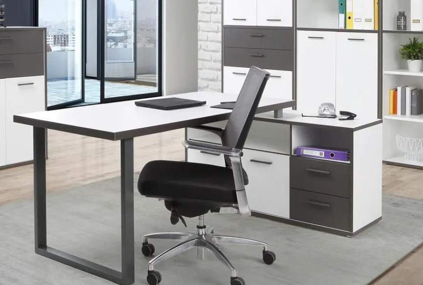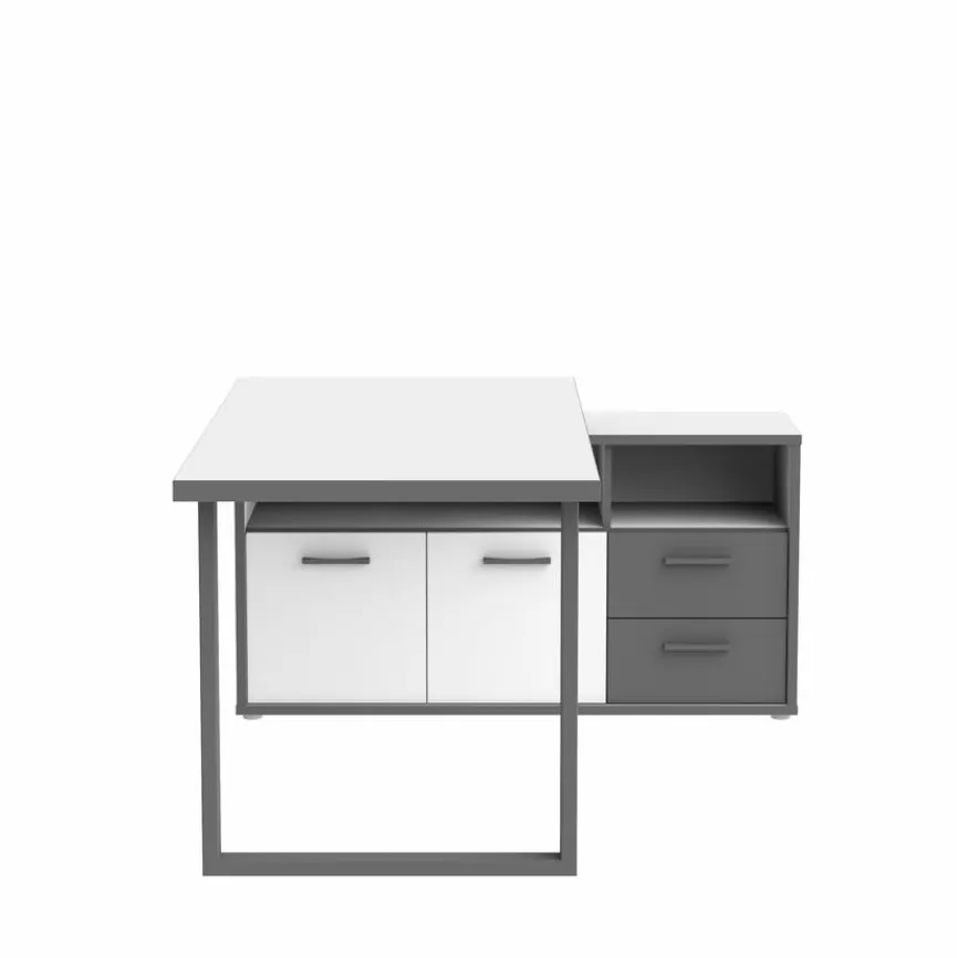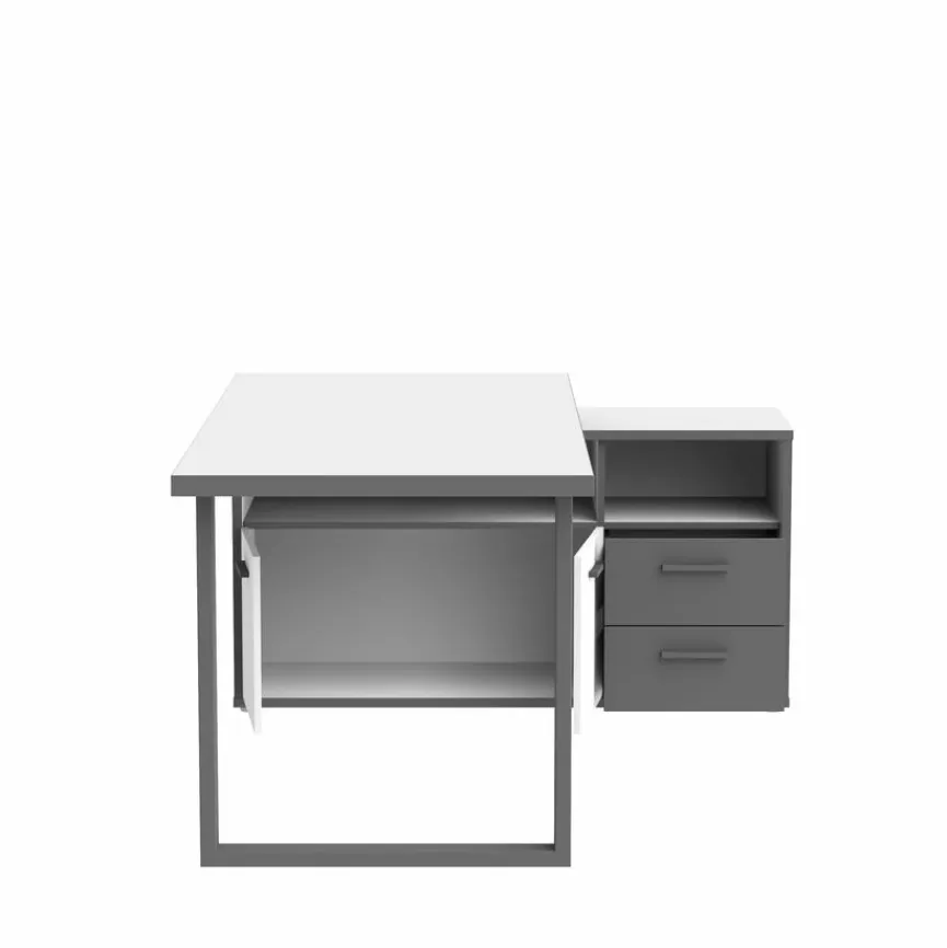 - Aus Holzwerkstoff (Spanplatte) in Weiß, Kontrastkante und Schubkästen aus Holzwerkstoff (Spanplatte) in Uni Wolfram Grau, Rückwand aus Holzwerkstoff (HDF-Platten) in Weiß, Griffe aus Kunststoff in Grau, Füße aus Metall in Grau
