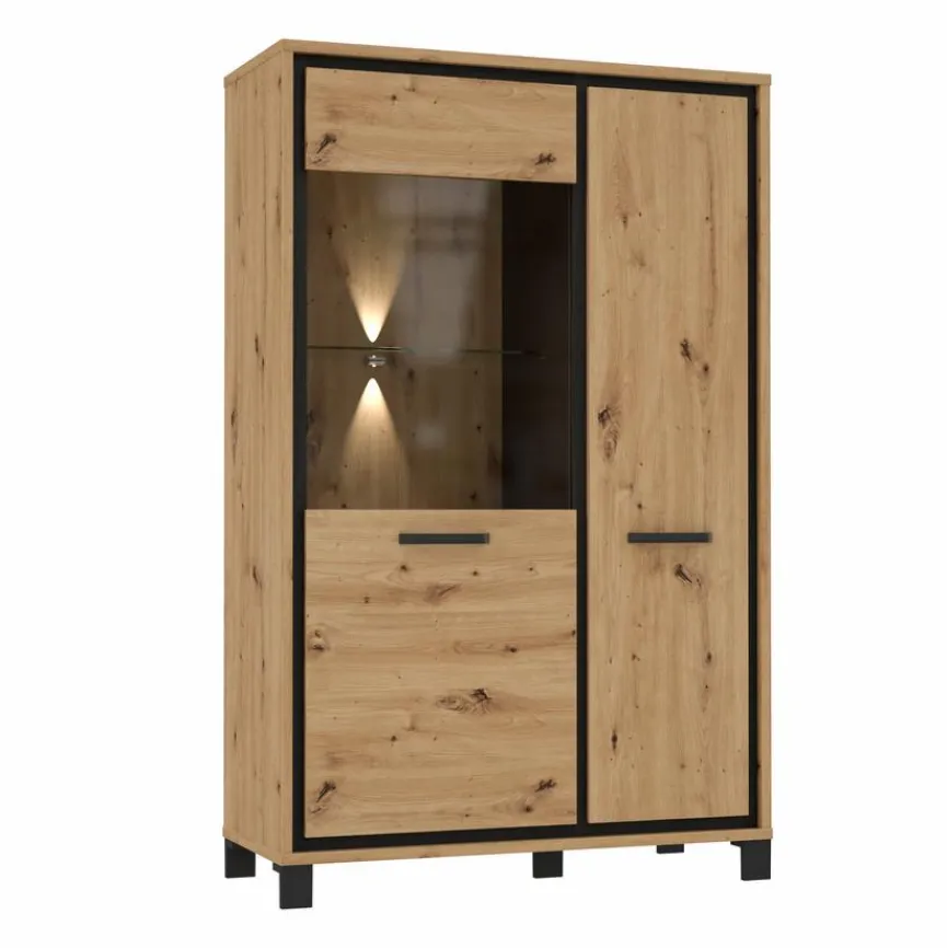 - Korpus und Front aus Holzwerkstoff mit hochwertiger Dekorfolie in Artisan Eiche kombiniert mit Eiche in schwarz, Griffe und Füße aus Metall in schwarz