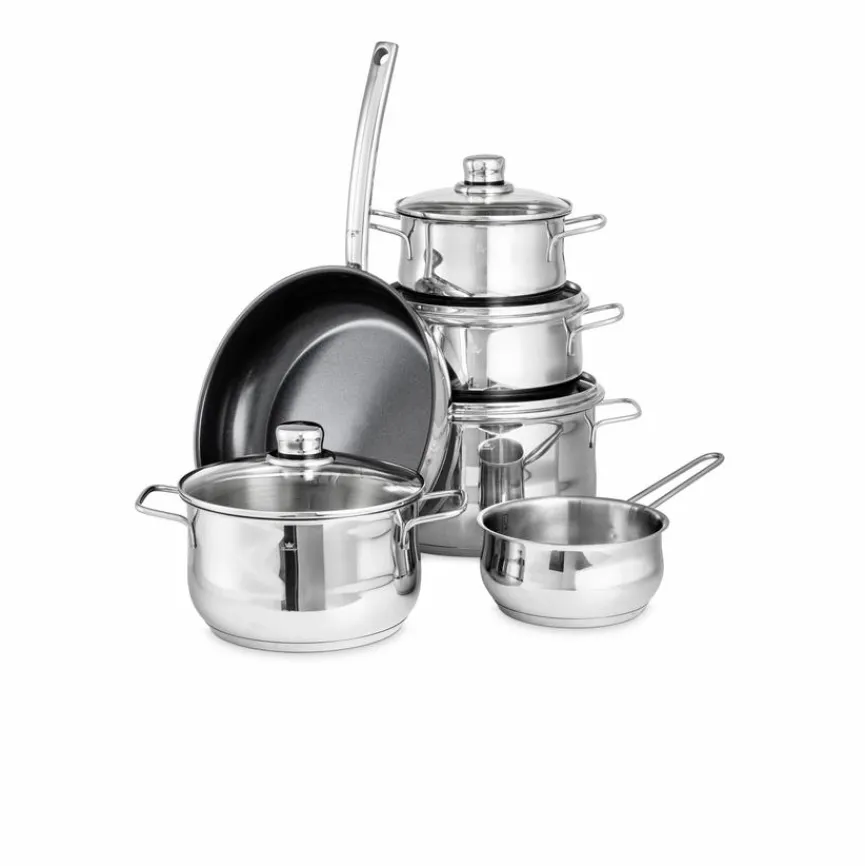 - Artikel beinhaltet je 1x Kochtopf Ø 16 cm, Ø 20 cm, Ø 24 cm, Bratentopf Ø 20 cm, jeweils mit Glasdeckel, Stielkasserolle Ø 16 cm und Pfanne Ø 28 cm