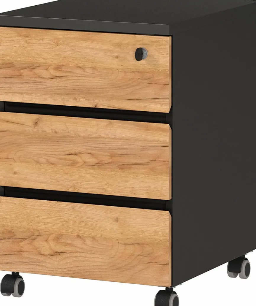 - Aus Holzwerkstoff (Spanplatte) mit kratzfester Melaminharzfolie in graphit, Schubkastenfronten in Eiche-Navarra-Nachbildung