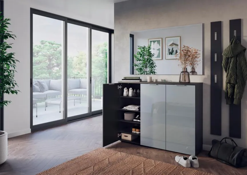 Praktisch und formschön bildet das Garderobenpaneel Veria von Germania im Eingangsbereich die gelungene Visitenkarte für die folgenden Räume. Das Dielenpaneel mit Haken in unterschiedlichen Höhen hält Jacken und Mäntel von großen oder kleinen Gästen griffbereit. Auch in schmalen Fluren schaffen Sie mit dem Garderobenpaneel Veria Platz und Ordnung.