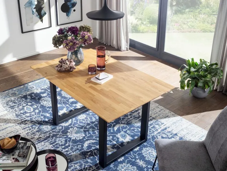 - Tischplatte aus massiver Wildeiche in Parkettverleimt und geölt