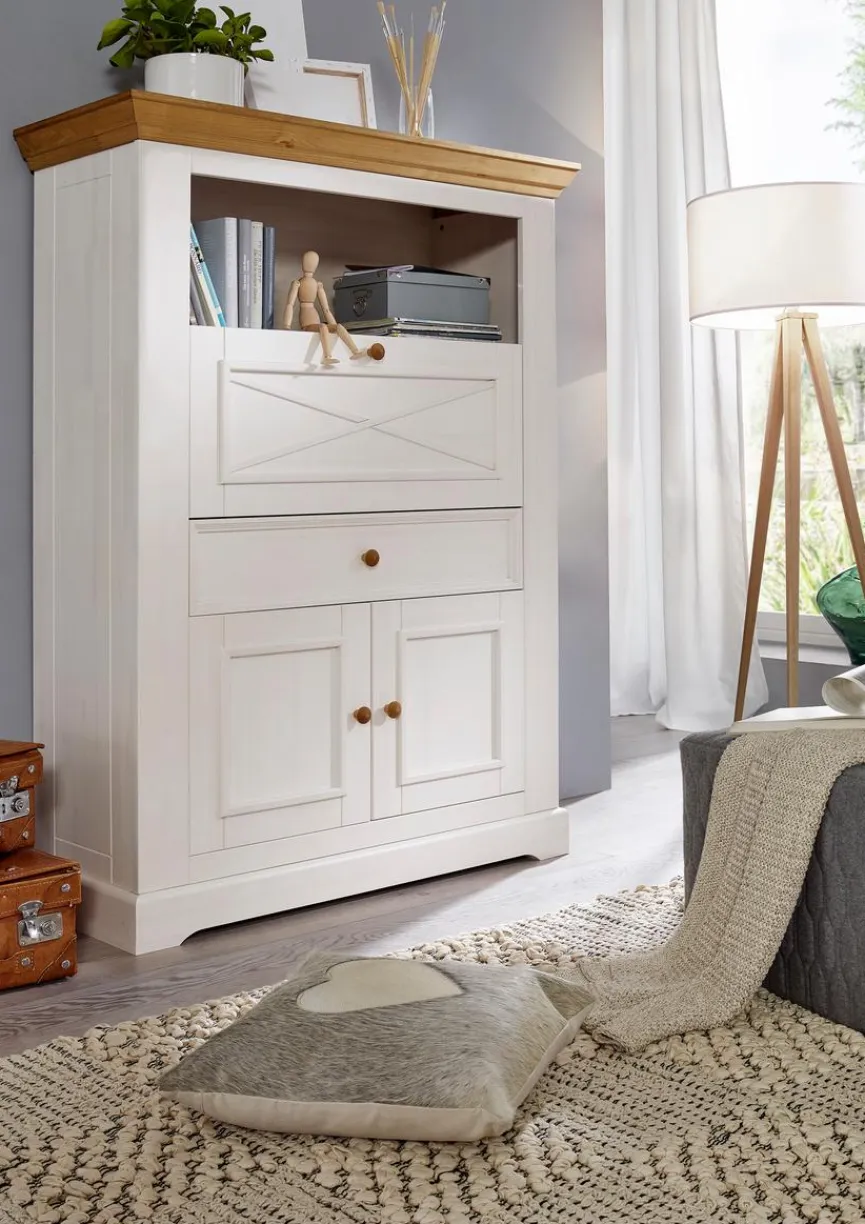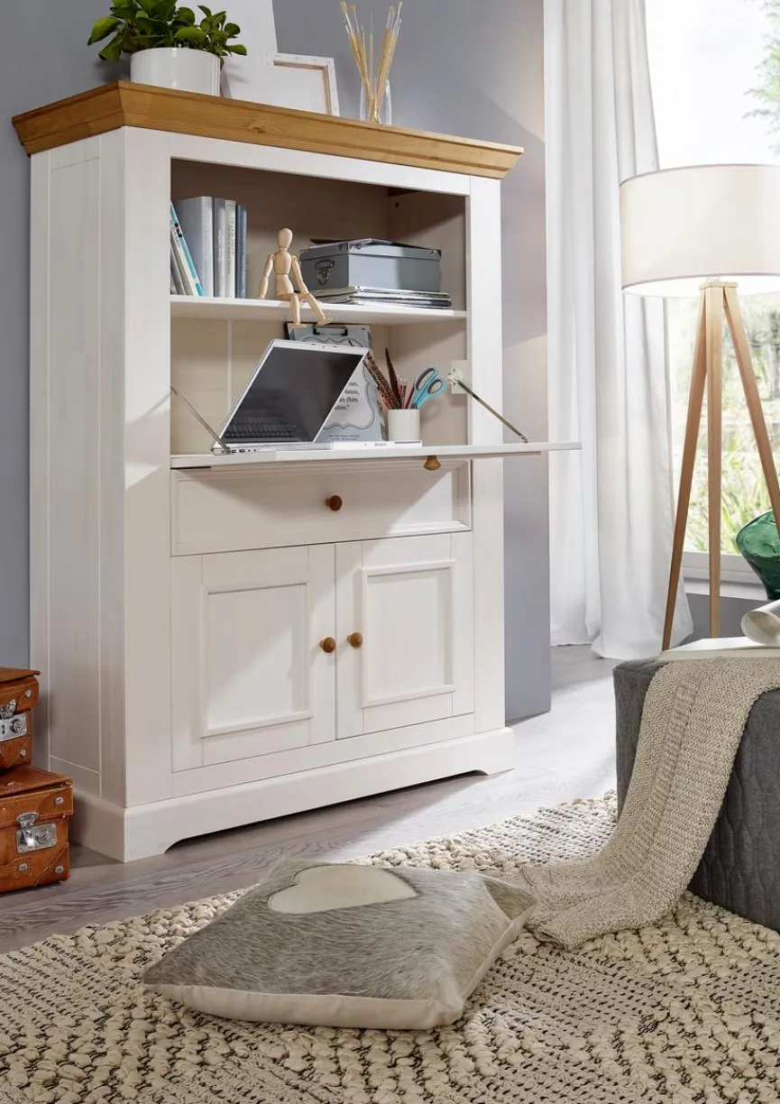 Der Sekretär Minnesota präsentiert sich in einem schicken Design im Landhaus-Stil. Die Optik der Kommode wird durch die geschmackvolle Formgebung und die farblich abgesetzte Abdeckplatte bestimmt. Darüber hinaus bietet das Sekretär in vielen verschiedenen Fächern ausreichend Stauraum für die Aufbewahrung diverser Gegenstände.