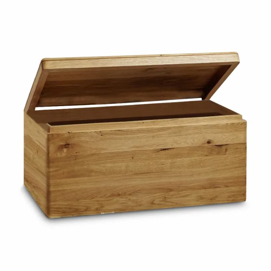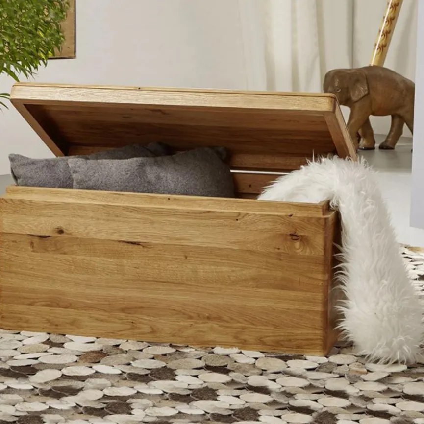 Diese Truhe präsentiert sich in einem warmen Holzton. Die hochwertige Verarbeitung dieses Möbels kann man sofort erkennen. Zur Herstellung der Truhe wurde besonders dickes Holz verwendet, bei dem jedes Stück aufgrund seiner Struktur einzigartig ist. Neben der langen Haltbarkeit verspricht das robuste Material eine leichte Pflegemöglichkeit mit einem feuchten Tuch. Darüber hinaus bietet das Möbel viel Platz, um Gegenstände jeder Art ordentlich zu verstauen.