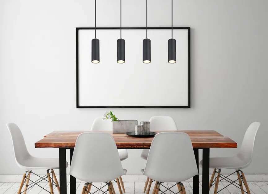 Wenn Sie Ihr Wohn-, Schlaf-, Esszimmer oder Ihre Küche modern eingerichtet haben, eignet sich die zierliche Pendelleuchte Robby der Marke Globo perfekt für Ihr Zuhause. Während der Montage können Sie die feine Pendellampe exakt auf Ihre Wünsche einstellen. Der vier zylinderförmigen Schirme der Pendelleuchte Robby verbergen je eine GU10 Fassung, die an einem Kabel hängt.