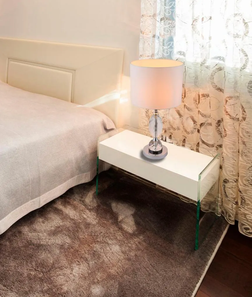 Die attraktive Tischleuchte BRONN von Globo sorgt nicht nur für eine schöne Beleuchtung, sondern ist auch optisch ein absolutes Hightlight. Stilvoll präsentiert sich die Tischlampe in einem schönen Materialmix aus Chrom, klarem Kristallglas und weißem Textil. Egal, in welchem Raum, die Globo Tischleuchte BRONN ist eine schöne Bereicherung für jedes Heim.