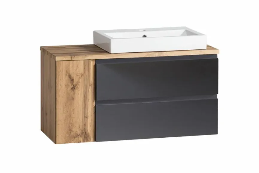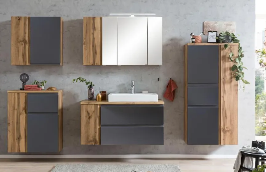 - Front aus Holzwerkstoff (MDF) mit hochwertiger Dekorfolie in wotaneiche und matt grau