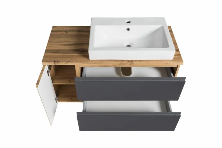 - Mit Waschbeckenunterschrank inkl. 1 Tür mit gedämpfter Scharniere und 1 Einlegeböden und 2 Metallauszüge inkl. Soft-Close-Funktion