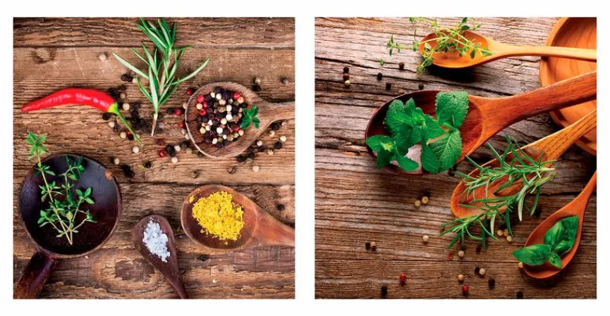 Leckere Gewürze und jede Menge rustikales Holz sind auf dem Glasbild 2tlg. Herbal Parade II von EUROART dargestellt. Damit eignet sich das Glasbild 2tlg. Herbal Parade II aus dem Hause EUROART zum Beispiel hervorragend dafür, um im Bereich der Essgruppe für ein appetitanregendes und gemütliches Ambiente zu sorgen. Auch in einer Küche macht es sich besonders gut.
