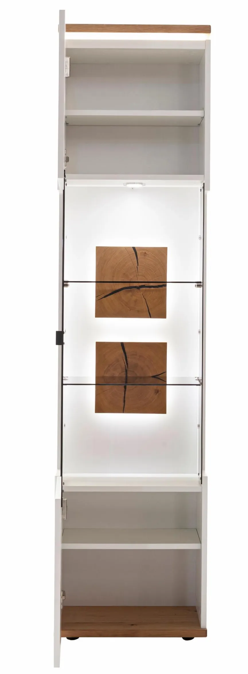 - Korpus und Front aus Holzwerkstoff (Spanplatte) mit Lack in Soft White, Absetzung aus Holzwerkstoff (Spanplatte) Ast/Balkeneiche furniert in Wildeiche geölt