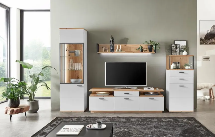 - Aus Holzwerkstoff (Spanplatte) mit kratzfester Melaminharzfolie in Modern White, Absetzung aus Spanplatte mit kratzfester Melaminharzfolie in Eiche Artisan, Sichtbare Rückwand aus Holzwerkstoff (HDF) mit kratzfester Melaminharzfolie in Eiche Artisan