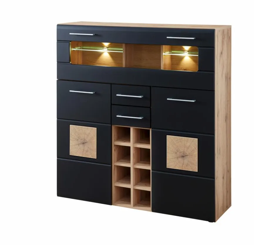 - 2-trg., mit 1 Glas-/Holzklappe, 2 Schubkästen und 1 Flaschenregal