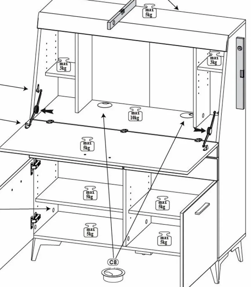 - Mit 1 Klappe, 2 Schubkästen und 2 Türen