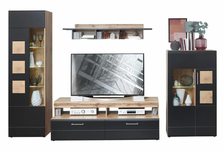 - Bestehend aus: 1 TV-Lowboard, 1 Standvitrine, 1 Highboard, 1 Wandboard