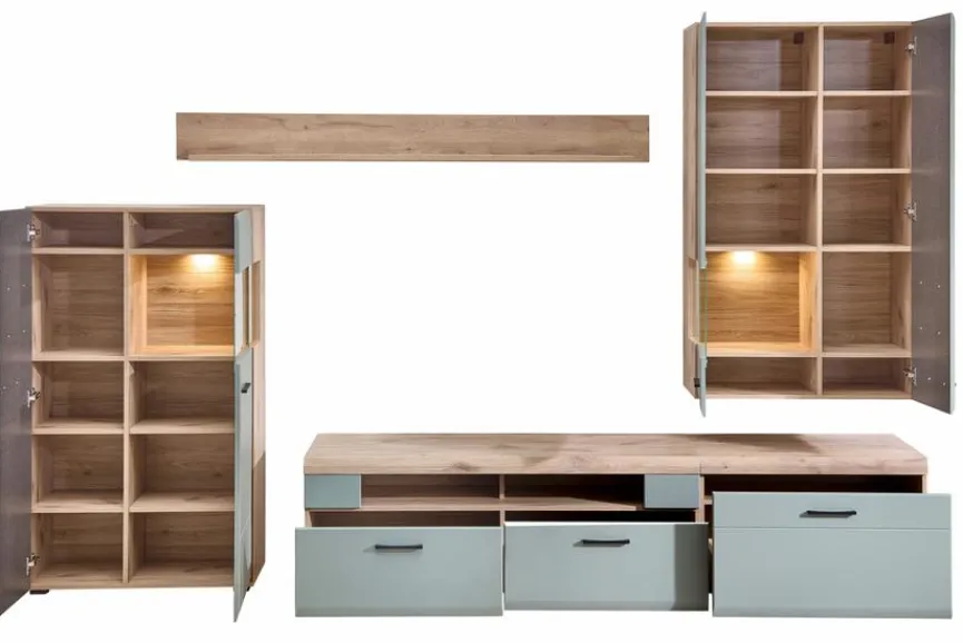 - TV-Lowboard mit 2 Schubkästen und 2 offenen Fächern, Unterteil mit 1 Schubkasten, Vitrine mit 1 Türe und 8 Böden, Hängevitrine mit 2 Türen und 8 Böden, Wandboard mit 1 Ablageboden