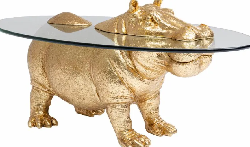 Wenn Sie extravagante und verspielte Wohnaccessoires mögen, dann erobert der Couchtisch Hippo 86187 von KARE DESIGN Ihr Herz ganz bestimmt im Sturm. Keinem Betrachter wird es gelingen, seinen Blick von diesem Wohnzimmertisch in Form eines güldenen Nilpferds abzuwenden. Wenn es einen Möbelstück verdient, als Eye-Catcher bezeichnet zu werden, dann der KARE DESIGN Couchtisch Hippo 86187.