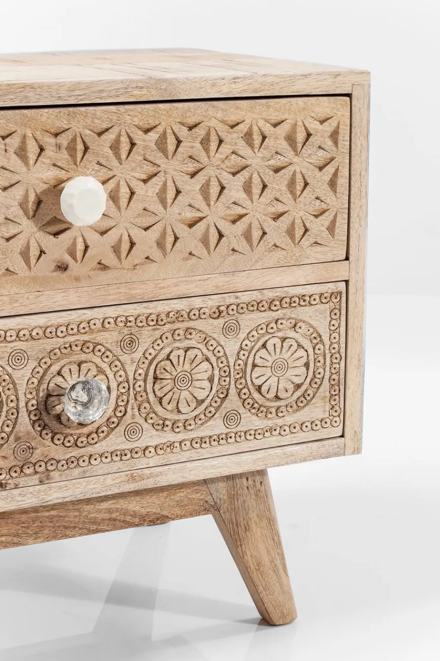 KARE präsentiert mit dem Nachttisch Puro Plain aus lackiertem Mangoholz einen echten Hingucker. Geschmackvolle Ornamente und stilvolle Griffe aus Knochen und Glas verleihen der Nachtkonsole einen individuellen und ansprechenden Look. In zwei Schubladen bietet der Nachttisch Puro Plain von KARE Platz für Bücher und andere Kleinigkeiten.