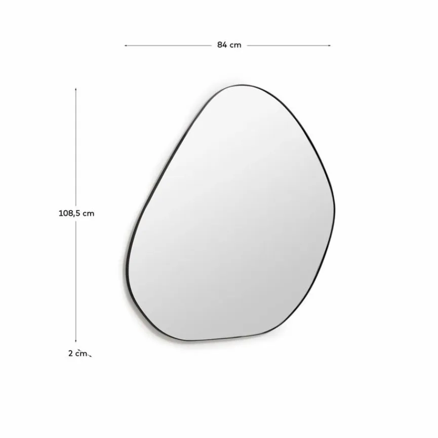 Der Spiegel Anera von Kave Home ist ungewöhnlich asymmetrisch geformt und in schwarzem Metall eingefasst. Er ist ein echter Hingucker in Ihren Innenräumen und zieht sofort den Blick auf sich. Lassen Sie Ihren Wohnraum durch den Spiegel Anera optisch vergrößern und erhellen.