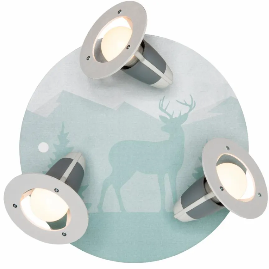 Die Kinderlampe Scandi Wald von Elobra passt wunderbar in ein fröhlich und modern eingerichtetes Kinderzimmer. Zu sehen ist auf dieser Kinderleuchte mit rundem Sockel ein Hirsch vor einer Bergkulisse. Dank der flexibel verstellbaren Spots lässt sich die Kinderlampe Scandi Wald aus dem Hause Elobra gut an die Gegebenheiten im Raum anpassen.