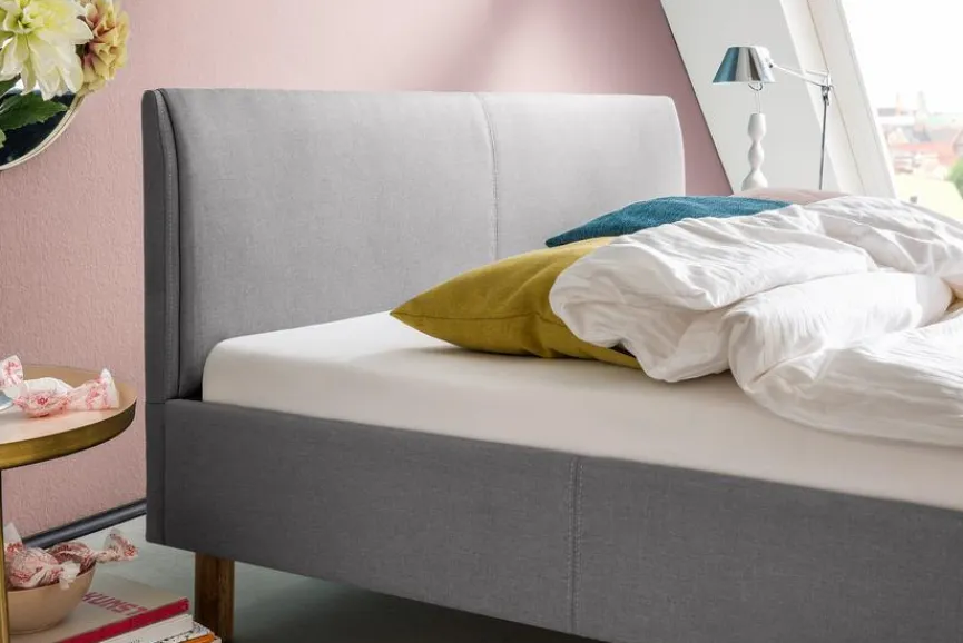 - Bettgestell aus Spanplatte, Füße aus massiver Eiche , Bezug aus 100 % Polyester in hellgrau
