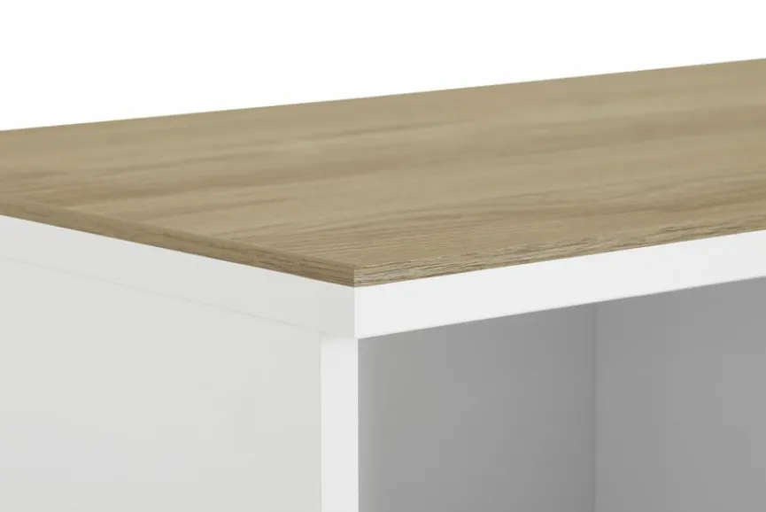 - Aus Holzwerkstoff (Spanplatte) mit kratzfester Melaminharzfolie in Off-White, Absetzung aus Holzwerkstoff (Spanplatte) mit kratzfester Melaminharzfolie in Eiche-Montana-Nachbildung, Griffe aus massiver Eiche