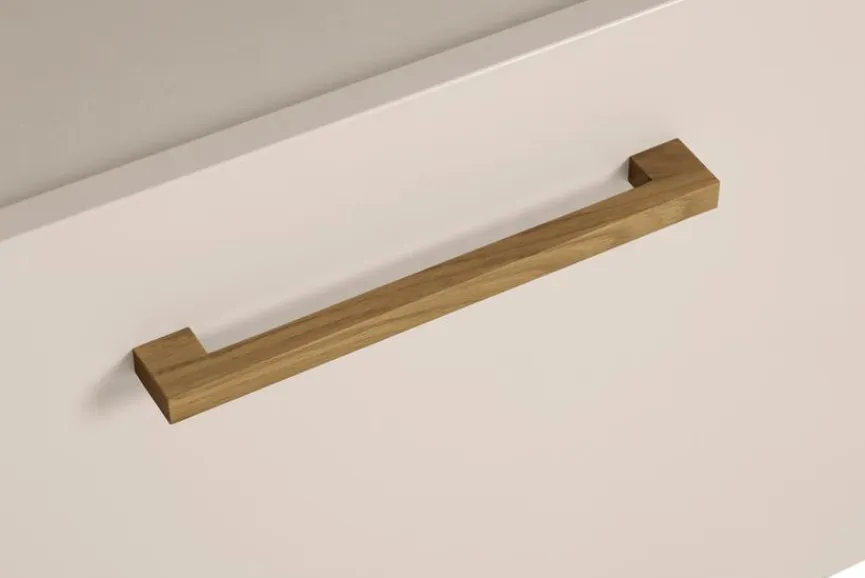 - Aus Holzwerkstoff (Spanplatte) mit kratzfester Melaminharzfolie in Cashmere-Beige, Füße, Griffe, Sockel und Deckplatte aus massiver Eiche