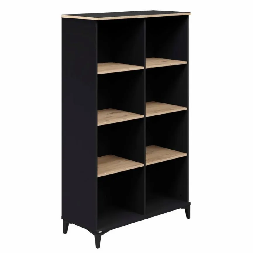 - Aus Holzwerkstoff (Spanplatte) mit kratzfester Melaminharzfolie in Naturschwarz, Kontrastkante und Einlegeböden aus Holzwerkstoff (Spanplatte) mit kratzfester Melaminharzfolie in Eiche-Bordeaux-Nachbildung