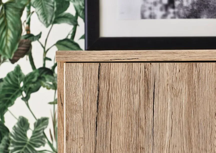 - Aus Holzwerkstoff (Spanplatte) mit hochwertiger Dekorfolie in San-Remo-Eiche-Nachbildung, Absetzungen in Graphit